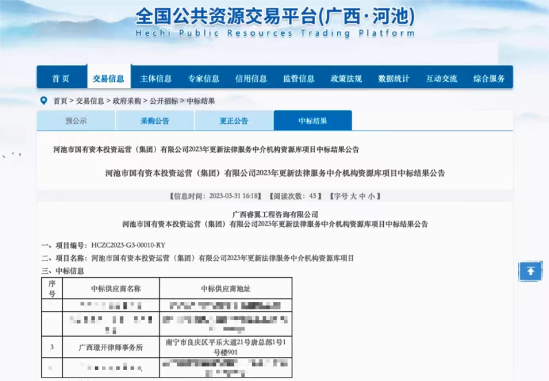 此次投標(biāo)項(xiàng)目,獲取招標(biāo)文件的單位為17家,遞交投標(biāo)文件的單位為10家,最終中標(biāo)的單位為4家。璟開律所以豐富的服務(wù)業(yè)績(jī)和服務(wù)經(jīng)驗(yàn)、完善的服務(wù)方案和良好的社會(huì)信譽(yù),經(jīng)過評(píng)標(biāo)篩選,成為4家中標(biāo)機(jī)構(gòu)之一。