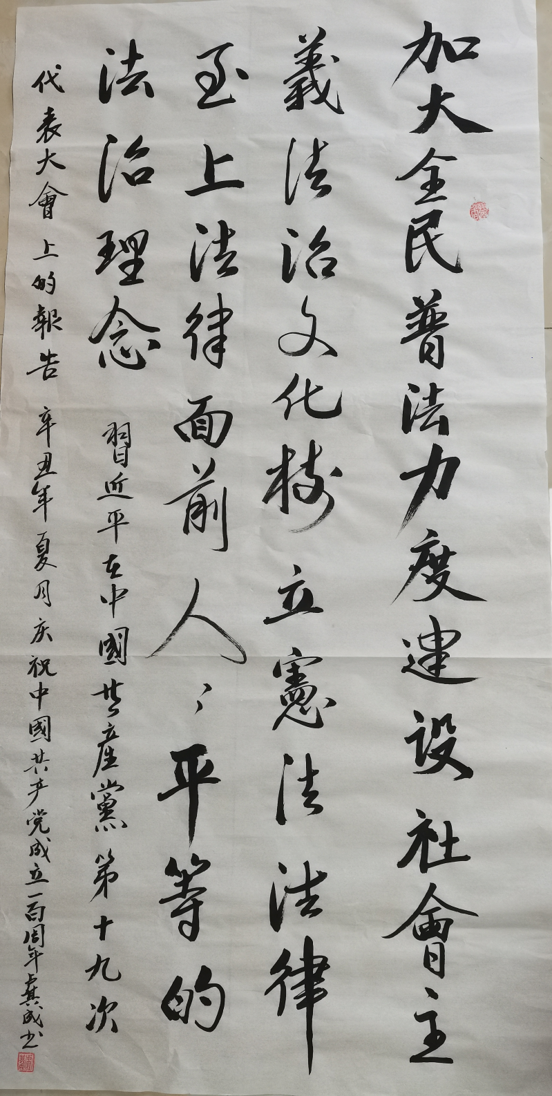 南寧市律師協(xié)會開展“百年鑄輝煌,律師跟黨走”書畫攝影作品比賽,本所盧其成律師以慶祝建黨100周年、傳播正能量為主旋律,展現(xiàn)建設(shè)壯美廣西、共圓復(fù)興夢想為主題,以國色天香水墨畫和習(xí)近平在中國共產(chǎn)黨第十九次人民代表大會上的報告講話內(nèi)容為主題的書法作品參賽。同行競技,逐夢前行,期待盧其成律師在比賽中榮獲佳績,展現(xiàn)謙行律師良好精神風(fēng)貌。