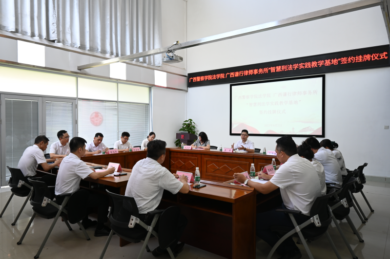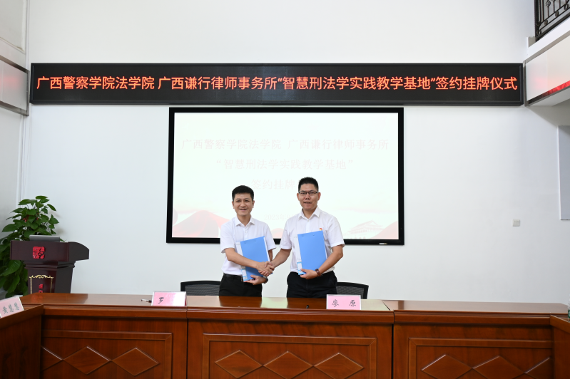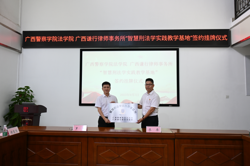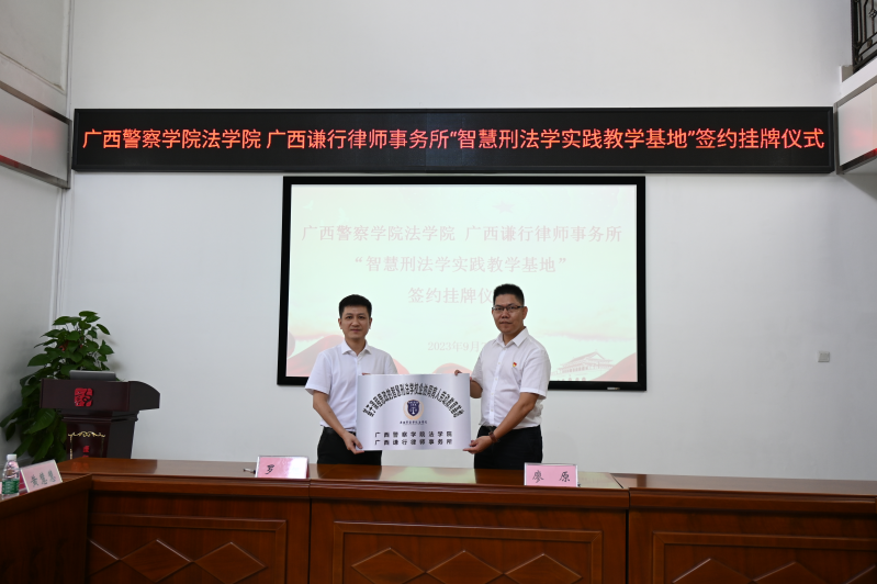 為深入推進(jìn)校所合作,深化產(chǎn)學(xué)研融合發(fā)展,促進(jìn)法律學(xué)術(shù)、實(shí)務(wù)、人才培養(yǎng),實(shí)現(xiàn)資源共享、協(xié)同發(fā)展,在法治人才培養(yǎng)領(lǐng)域取得新成績(jī)和新突破。2023年9月7日,廣西警察學(xué)院法學(xué)院與廣西謙行律師事務(wù)所舉行“智慧刑法學(xué)實(shí)踐教學(xué)基地”簽約授牌儀式。廣西警察學(xué)院教授、法學(xué)院院長(zhǎng)、刑事法教研室主任廖原,刑事法教研室副主任黃慧慧,副教授、副主任劉芷君,副教授李蜜、教師王靜,法學(xué)院辦公室負(fù)責(zé)人羅瑞成一行,廣西謙行律師事務(wù)所主任羅旭,副主任楊家聰、賴志權(quán)、譚京凱、滕黃鐵,合伙人蒙旭軍等謙行律師、實(shí)習(xí)律師參加簽約授牌儀式。