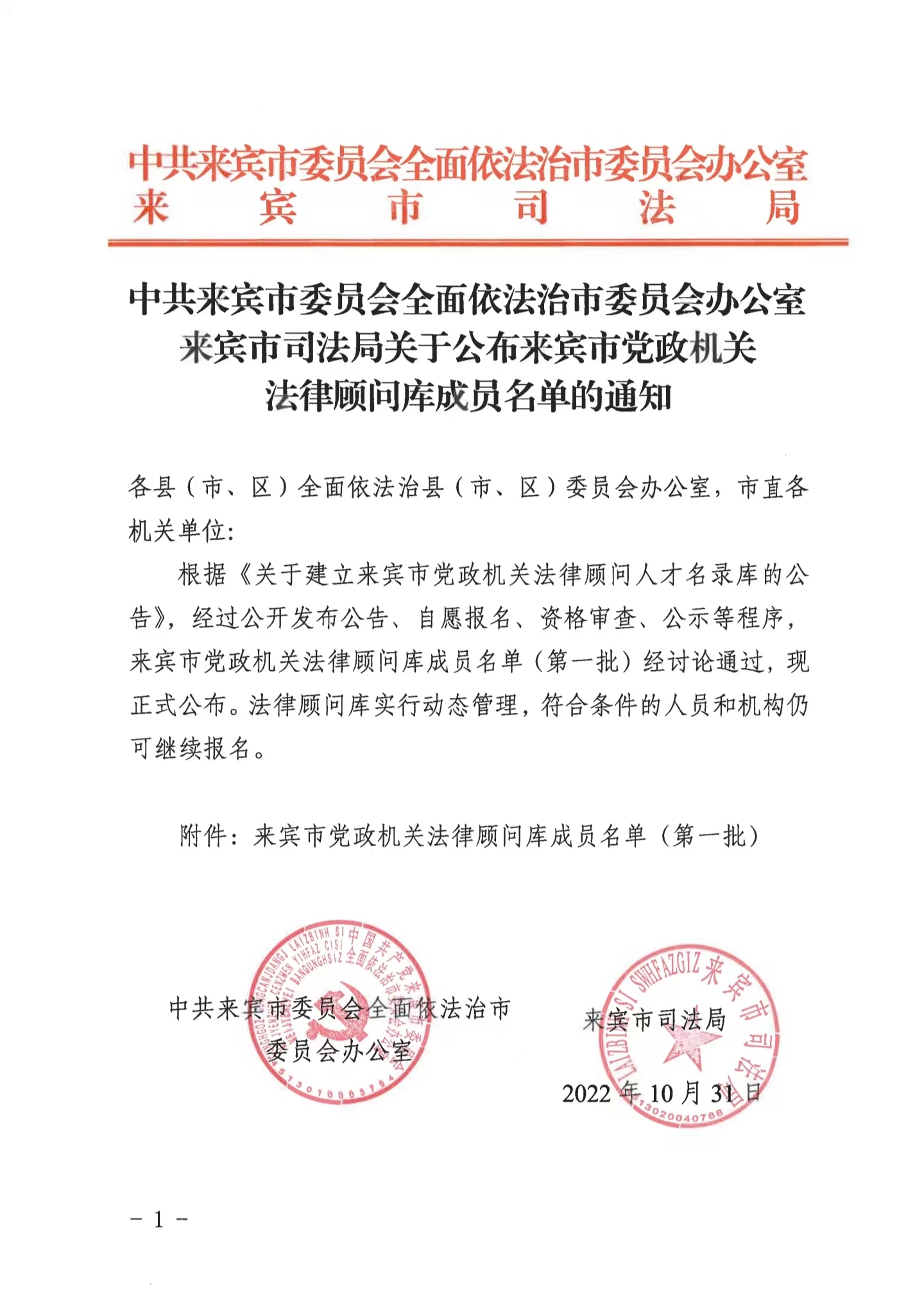 來賓市司法局為貫徹落實中共中央辦公廳、國務(wù)院辦公廳《關(guān)于推行法律顧問制度和公職律師公司律師制度的意見》《廣西壯族自治區(qū)人民政府辦公廳關(guān)于建立政府法律顧問制度的意見》(桂政辦發(fā)〔2015〕4號)《中共來賓市委員會依法治市委員會關(guān)于進一步加強黨政機關(guān)法律顧問工作的實施意見》(來法治委發(fā)〔2022〕3號)精神,推進法律顧問人才名錄庫建設(shè),經(jīng)研究,決定建立來賓市黨政機關(guān)法律顧問人才名錄庫。