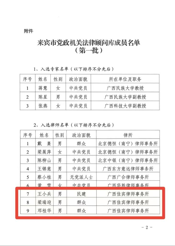 2022年10月31日,中共來賓市委員會全面依法治市委員會辦公室、來賓市司法局公布來賓市黨政機關(guān)法律顧問人才名錄庫成員名單,我所主任王小兵與副主任梁瑞迎、鄧桂華律師成功入選來賓市黨政機關(guān)法律顧問人才名錄庫!三位律師一致表示,今后將充分發(fā)揮自身的專業(yè)優(yōu)勢,盡職盡責(zé),為來賓市全面依法治市提供專業(yè)服務(wù)支持。