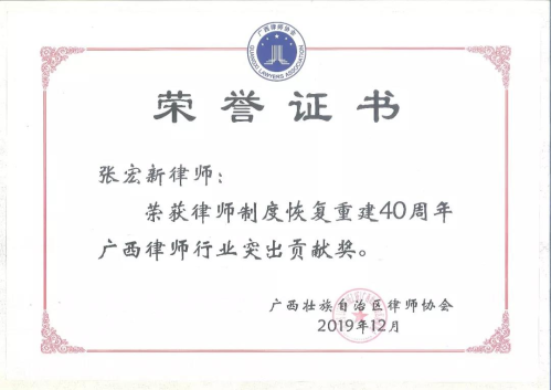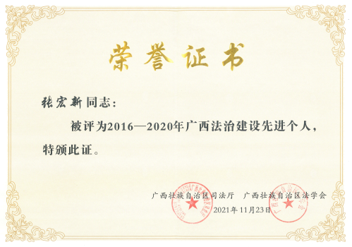 為充分發(fā)揮先進(jìn)示范引領(lǐng)作用,加快建設(shè)更高水平的法治廣西,廣西壯族自治區(qū)司法廳、廣西壯族自治區(qū)法學(xué)會(huì)印發(fā)《關(guān)于表彰2016—2020年廣西法治建設(shè)先進(jìn)集體和先進(jìn)個(gè)人的決定》,廣西宏松律師事務(wù)所主任張宏新律師榜上有名,被授予“2016—2020年廣西法治建設(shè)先進(jìn)個(gè)人”榮譽(yù)稱(chēng)號(hào)。