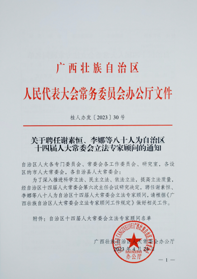 2023年4月28日上午,自治區(qū)十四屆人大常委會(huì)立法專家顧問(wèn)聘書頒發(fā)儀式在廣西人民會(huì)堂五樓常委會(huì)會(huì)議廳召開,王小兵主任作為受聘任立法專家顧問(wèn)出席儀式并登臺(tái)領(lǐng)取聘任書。