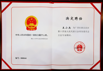 王小兵主任獲聘本屆自治區(qū)人大常委會(huì)立法專家顧問(wèn)前,還被南寧市人大常委會(huì)連續(xù)聘任為第十四屆、第十五屆人大常委會(huì)立法專家,此次受聘后將繼續(xù)發(fā)揮專業(yè)特長(zhǎng),為自治區(qū)人大立法工作提供專業(yè)支持,做好服務(wù)。