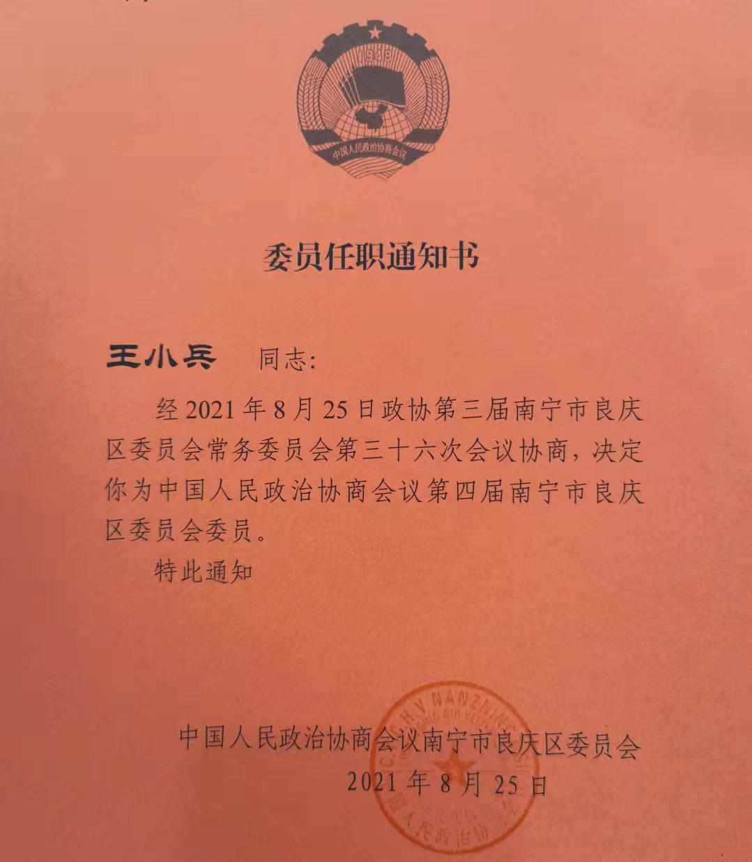 2021年8月25日,政協(xié)第三屆南寧市良慶區(qū)委員會常務(wù)委員會第三十六次會議在南寧召開。會議審議通過了中國人民政治協(xié)商會議第四屆南寧市良慶區(qū)委員會委員名單。廣西佳賓律師事務(wù)所主任王小兵律師當(dāng)選政協(xié)第四屆南寧市良慶區(qū)委員會委員。