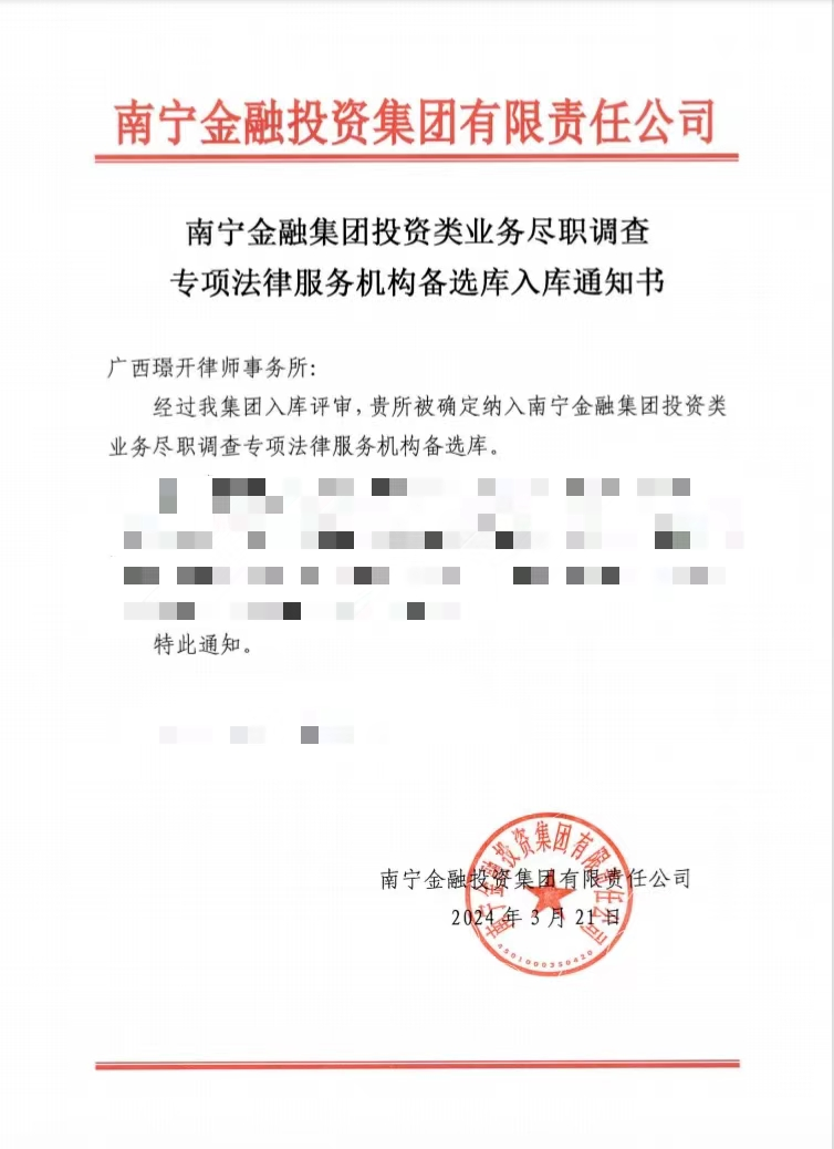 近日,經(jīng)南寧金融集團(tuán)評審,璟開律所成功入選南寧金融集團(tuán)投資類業(yè)務(wù)盡職調(diào)查專項法律服務(wù)機(jī)構(gòu)庫。