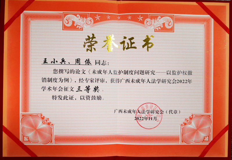 廣西未成年人法學(xué)研究會(huì)2022年學(xué)術(shù)年會(huì)于2022年11月26日在南寧市召開(kāi)。本次學(xué)術(shù)年會(huì)碩果累累,共收到來(lái)自國(guó)內(nèi)外的論文329篇。經(jīng)組織專家按照政治標(biāo)準(zhǔn)、學(xué)術(shù)標(biāo)準(zhǔn)、社會(huì)價(jià)值標(biāo)準(zhǔn)進(jìn)行匿名評(píng)審,并進(jìn)行學(xué)術(shù)不端監(jiān)測(cè),共評(píng)選出獲獎(jiǎng)?wù)撐?0 篇。廣西佳賓律師事務(wù)所王小兵和周依同志共同撰寫(xiě)的論文《未成年人監(jiān)護(hù)制度問(wèn)題研究——以監(jiān)護(hù)權(quán)撤銷(xiāo)制度為例》榮獲三等獎(jiǎng)。