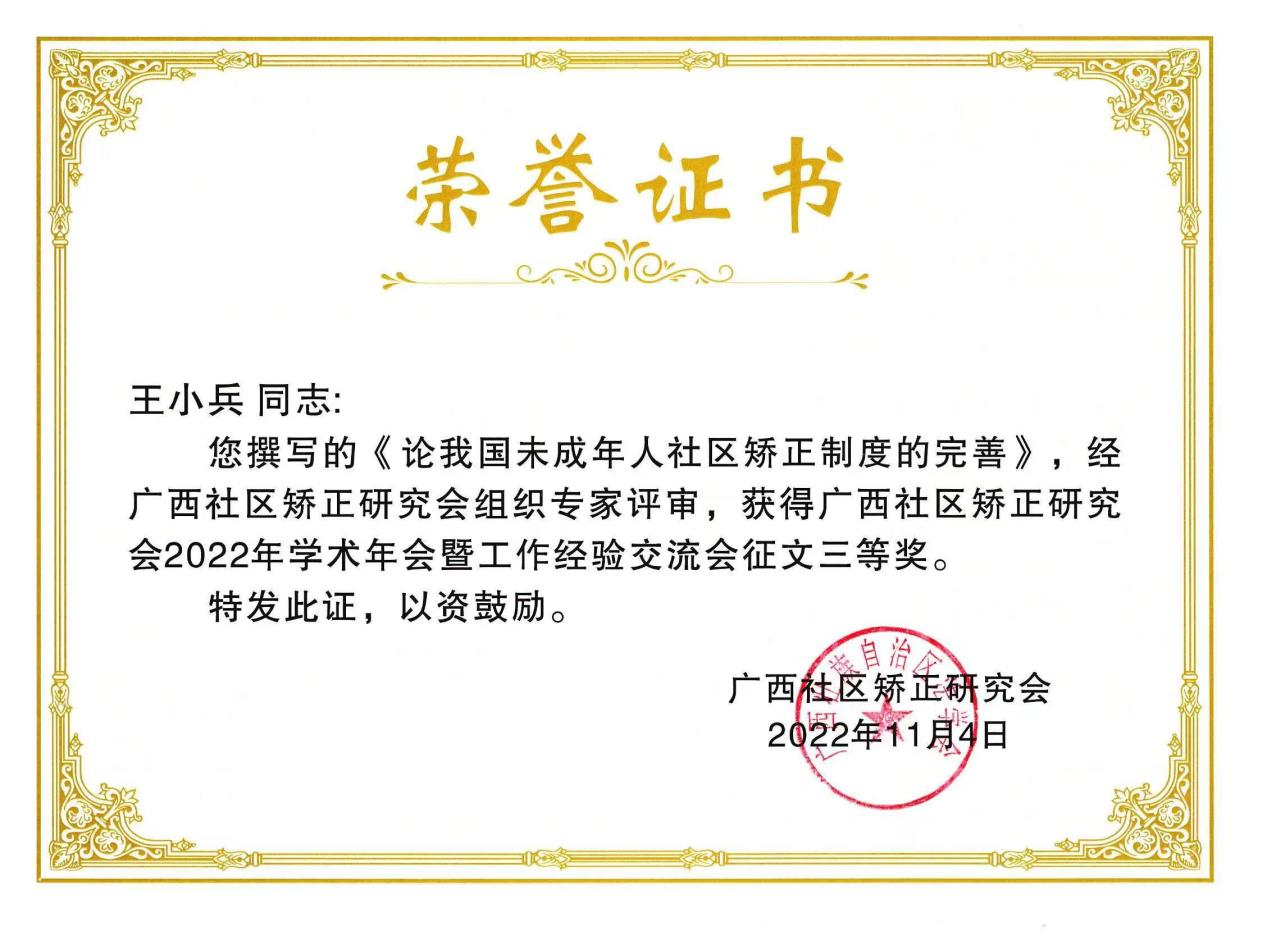 廣西社區(qū)矯正研究會2022年學(xué)術(shù)年會暨工作經(jīng)驗(yàn)交流會于2022年11月4日-5日在廣西百色市召開。我所主任王小兵律師撰寫的論文《論我國未成年人社區(qū)矯正制度的完善》榮獲廣西社區(qū)矯正研究會2022年學(xué)術(shù)年會暨工作經(jīng)驗(yàn)交流會征文三等獎(jiǎng)。