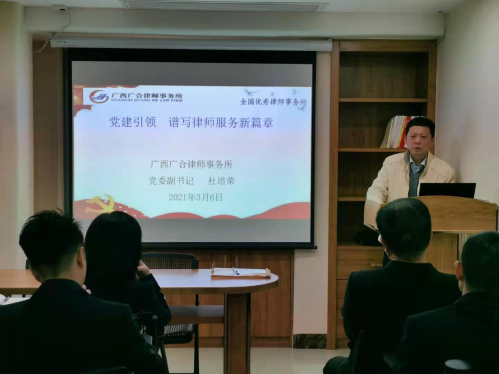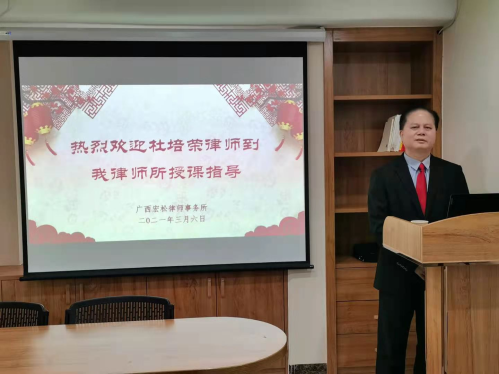 2021年3月6日上午,宏松所組織律師開展了2021年第一期律師業(yè)務(wù)能力培訓(xùn)活動。本次培訓(xùn)的主題為“黨建引領(lǐng),譜寫律師服務(wù)新篇章”,特邀廣西廣合律師事務(wù)所黨委副書記、副主任杜培榮律師作為主講嘉賓進(jìn)行授課。培訓(xùn)由宏松所主任張宏新律師主持。