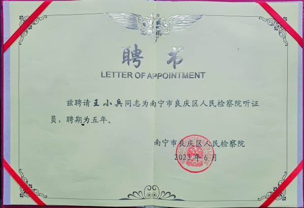 2023年6月,南寧市良慶區(qū)人民檢察院決定聘請廣西佳賓律師事務(wù)所主任王小兵律師為該院聽證員,并于2023年8月15日下發(fā)聘書,聘期為5年。王小兵律師執(zhí)業(yè)以來就專注于辦理刑事辯護(hù)的相關(guān)業(yè)務(wù),具有豐富的專業(yè)知識和辦案經(jīng)驗,此次被聘請為南寧市良慶區(qū)人民檢察院聽證員一定會繼續(xù)發(fā)揮自身的專業(yè)優(yōu)勢,切實履行聽證監(jiān)督職責(zé),為實現(xiàn)良慶區(qū)更好的司法辦案效果貢獻(xiàn)一份力量。