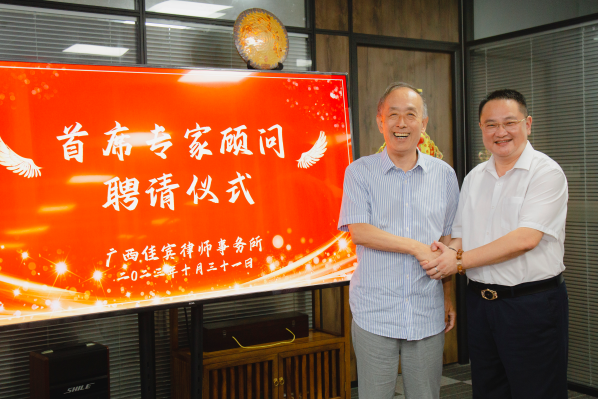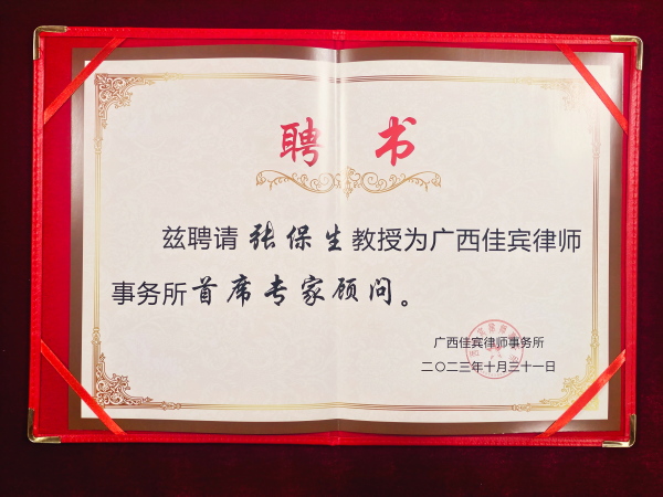 2023年10月31日,廣西佳賓律師事務(wù)所聘請張保生教授擔(dān)任佳賓所“首席專家顧問”,當(dāng)日下午在本所辦公室舉行“首席專家顧問”聘請儀式。在全所律師的見證下,佳賓所主任王小兵律師為張教授頒發(fā)聘書并獻(xiàn)上鮮花。