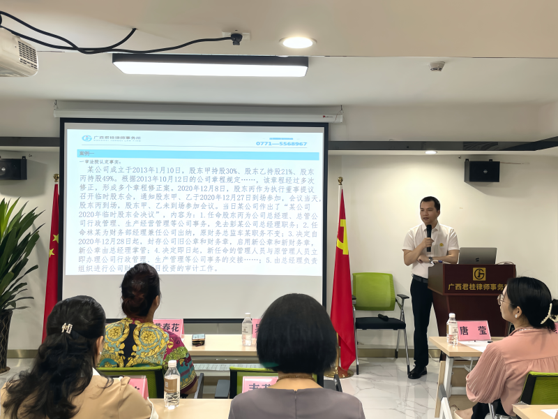 接著,由我所高級(jí)合伙人、投融資法律顧問(wèn)團(tuán)隊(duì)負(fù)責(zé)人吳樹君律師為大家開展了《企業(yè)法律風(fēng)險(xiǎn)防范系列課程》專題講座。吳律師從股東會(huì)會(huì)議的類型、股東會(huì)決議有效性、股東會(huì)議事方式和表決程序以及股東會(huì)會(huì)議的法定召集程序等方面進(jìn)行了詳細(xì)講解,并通過(guò)“以案釋法”分析典型案例、熱點(diǎn)剖析的形式,講述法律風(fēng)險(xiǎn)防范的重要性以及如何有效防范于未然。