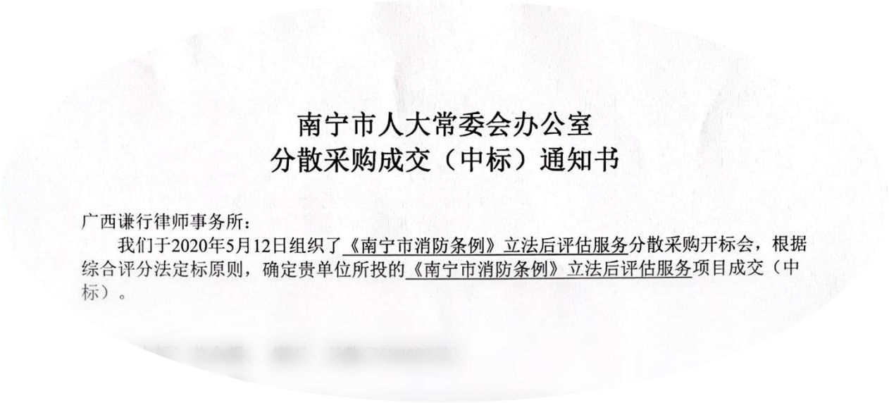 2020年5月12日,南寧市人大常委會(huì)組織了《南寧市消防條例》立法后評(píng)估服務(wù)分散采購開標(biāo)會(huì),廣西謙行律師事務(wù)所中標(biāo)該服務(wù)項(xiàng)目!這是繼去年成功完成《南寧市城市軌道交通管理?xiàng)l例》立法后評(píng)估項(xiàng)目后,我所又一次承接南寧市地方立法后評(píng)估專項(xiàng)法律服務(wù)項(xiàng)目。