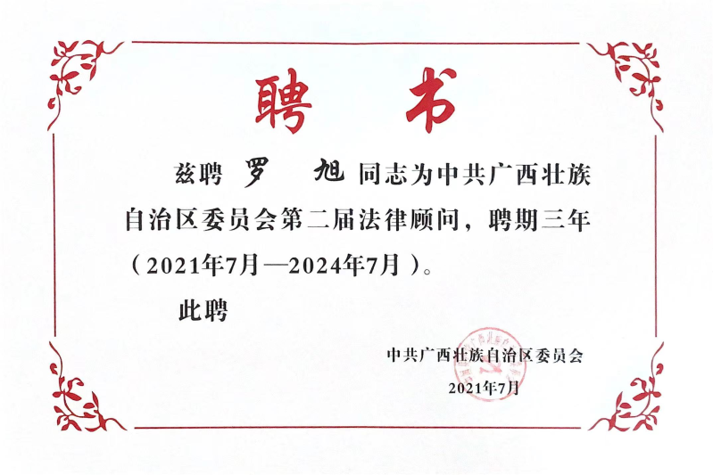 羅旭主任現(xiàn)任自治區(qū)第十三屆人大代表、自治區(qū)第十三屆人大法制委員會委員、南寧市第十四屆人大代表,中華全國律協(xié)理事、廣西律師行業(yè)黨委委員、廣西律師協(xié)會副會長、南寧市律師協(xié)會會長,自治區(qū)人大常委會、南寧市人大常委會立法專家,自治區(qū)黨委、自治區(qū)人民政府、南寧市委、南寧市人民政府法律顧問,廣西高級人民法院執(zhí)法監(jiān)督員,廣西壯族自治區(qū)人民檢察院專家咨詢委員會委員,南寧仲裁委員會委員、仲裁員。