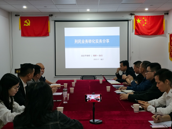 2023年12月12日上午,湖南中楚律師事務(wù)所高級(jí)合伙人、刑事法律事務(wù)部副主任田志平律師到廣西佳賓律師事務(wù)所做分享交流。本所主任王小兵律師代表佳賓所對(duì)田志平律師的到來(lái)表示熱烈歡迎。隨后,田律師就《刑民業(yè)務(wù)轉(zhuǎn)化實(shí)務(wù)分享》這一主題與佳賓所同仁做業(yè)務(wù)分享交流。