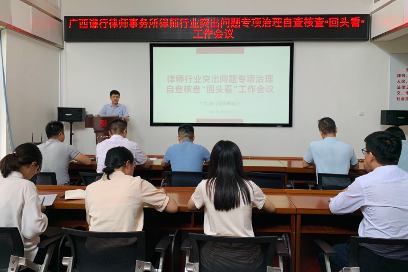 根據(jù)司法部律師行業(yè)突出問題專項(xiàng)治理工作組的統(tǒng)一部署,為扎實(shí)開展律師行業(yè)突出問題專項(xiàng)治理自查核查“回頭看”相關(guān)工作,7月19日,廣西謙行律師事務(wù)所在謙行模擬法庭召開律師行業(yè)突出問題專項(xiàng)治理自查核查“回頭看”工作會(huì)議。會(huì)議由羅旭主任主持,全所律師、實(shí)習(xí)律師參加會(huì)議。