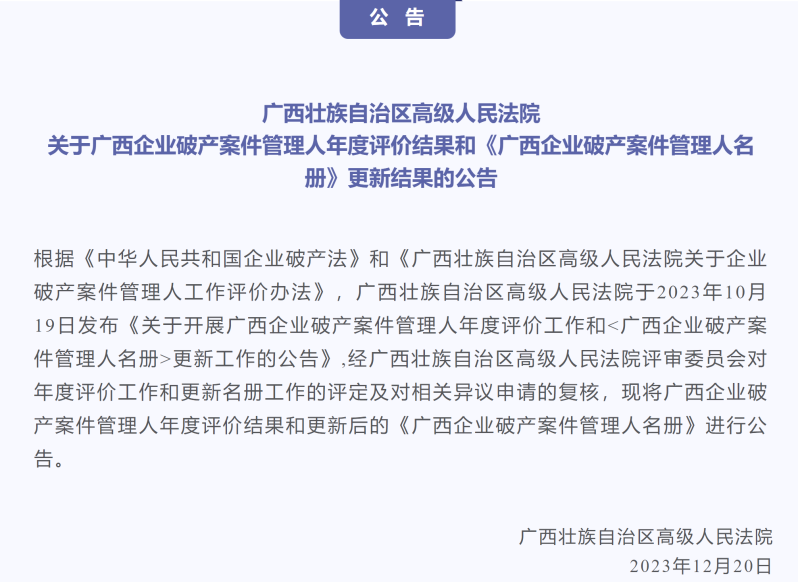 2023年12月20日,廣西壯族自治區(qū)高級人民法院發(fā)布公告,確定了更新后的《廣西企業(yè)破產(chǎn)案件管理人名冊》。廣西璟開律師事務(wù)所(以下簡稱“璟開律所”)成功入冊,取得破產(chǎn)管理人資格,可以接受人民法院的指定獨立承辦破產(chǎn)管理相關(guān)業(yè)務(wù)。本次更新名冊后,入冊破產(chǎn)管理人中的律所共156家,其中南寧57家。