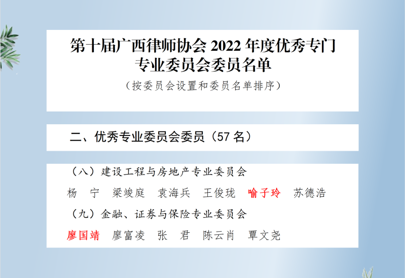廣西璟開律師事務(wù)所廖國靖、喻子玲律師獲評為第十屆廣西律師協(xié)會2022年度優(yōu)秀專業(yè)委員會委員。