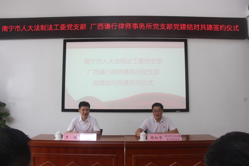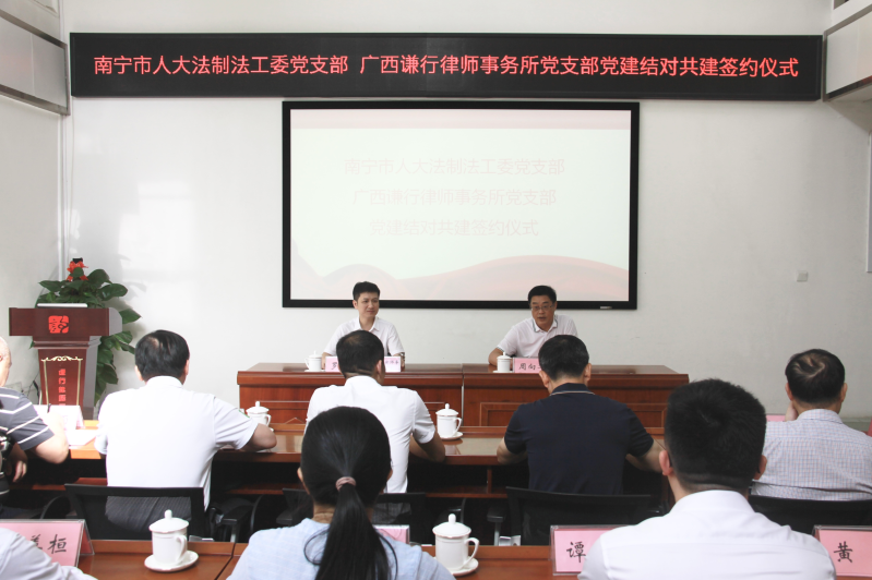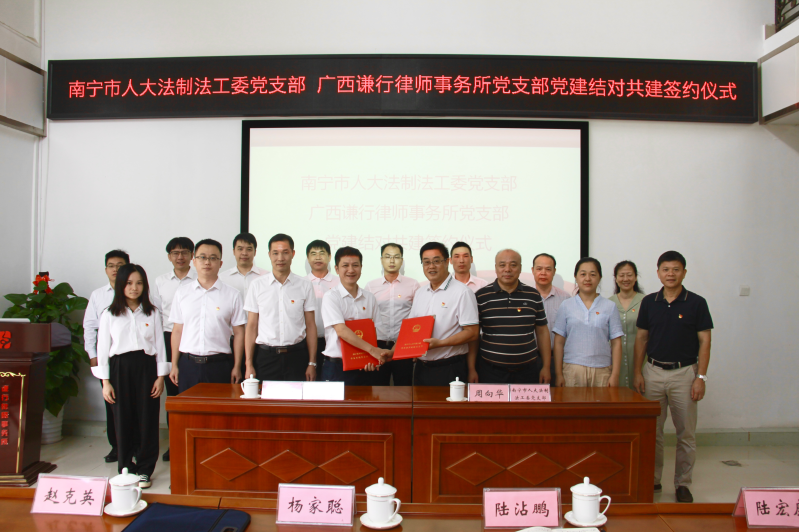 隨后,南寧市人大法制法工委黨支部與廣西謙行律師事務(wù)所黨支部簽署了黨組織結(jié)對共建協(xié)議書。