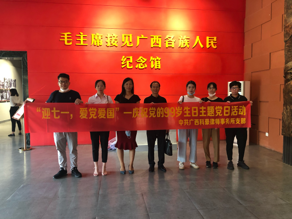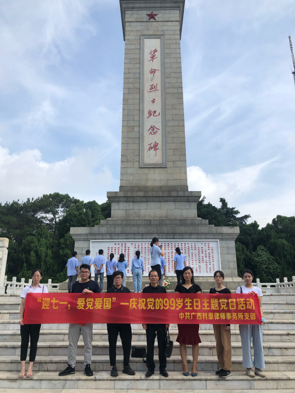 2020年7月1日,為紀(jì)念中國共產(chǎn)黨成立99周年,中共廣西科豪律師事務(wù)所支部在南寧市人民公園開展“迎七一,愛黨愛國”—慶祝黨的99歲生日主題黨日活動。