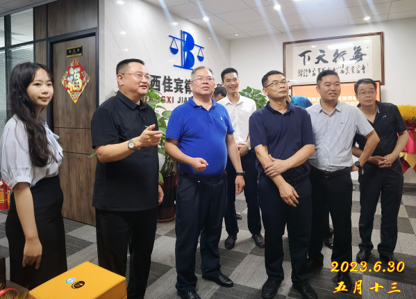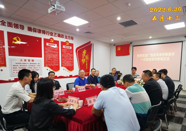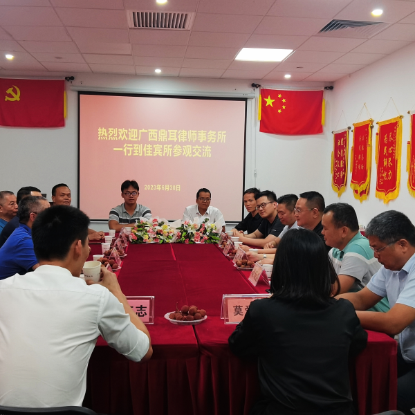 2023年6月30日下午,廣西鼎耳律師事務所一行8人在鼎耳所首席合伙人溫燕飛律師、鼎耳所主任伍嘯律師的帶領下到佳賓所參觀交流。佳賓所主任王小兵律師及佳賓所成員對鼎耳所同行的到來表示熱烈的歡迎,隨后雙方舉行了座談。