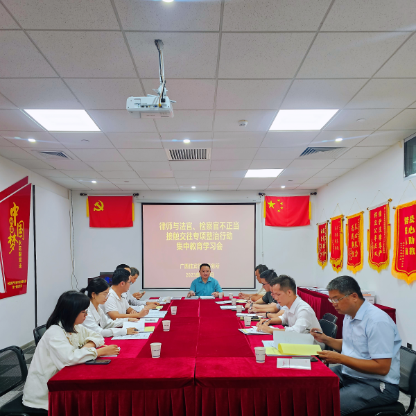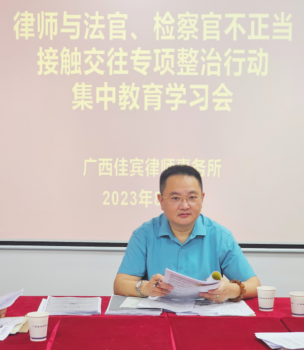 根據自治區(qū)司法廳、南寧市司法局統(tǒng)一部署安排,今年開展全區(qū)律師與法官、檢察官不正當接觸交往專項整治行動。2023年8月2日下午,廣西佳賓律師事務所在本所大會議室召開集中教育學習會,會議由本所主任王小兵主持。