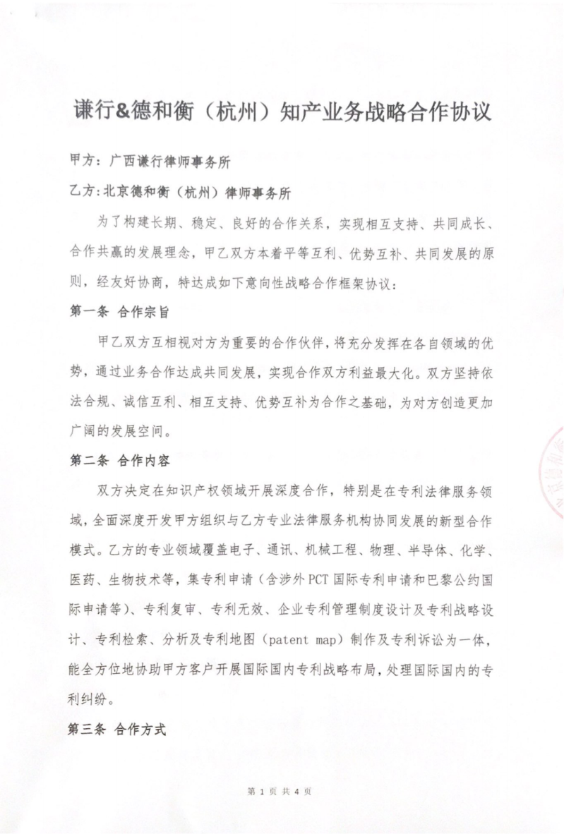 ▲謙行與北京德和衡(杭州)律師事務(wù)所知識產(chǎn)權(quán)戰(zhàn)略合作協(xié)議