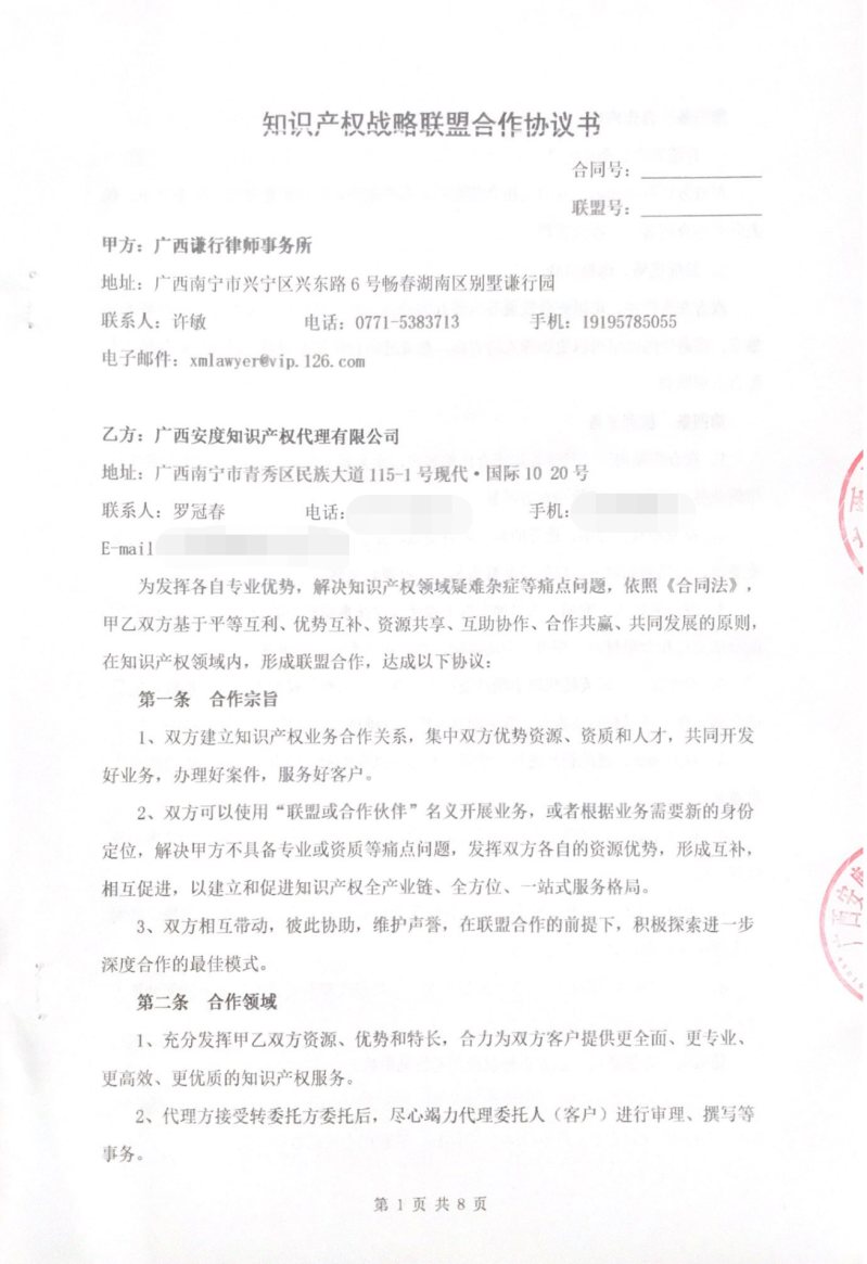 ▲謙行與廣西安度知識產(chǎn)權(quán)代理有限公司知識產(chǎn)權(quán)戰(zhàn)略聯(lián)盟合作協(xié)議