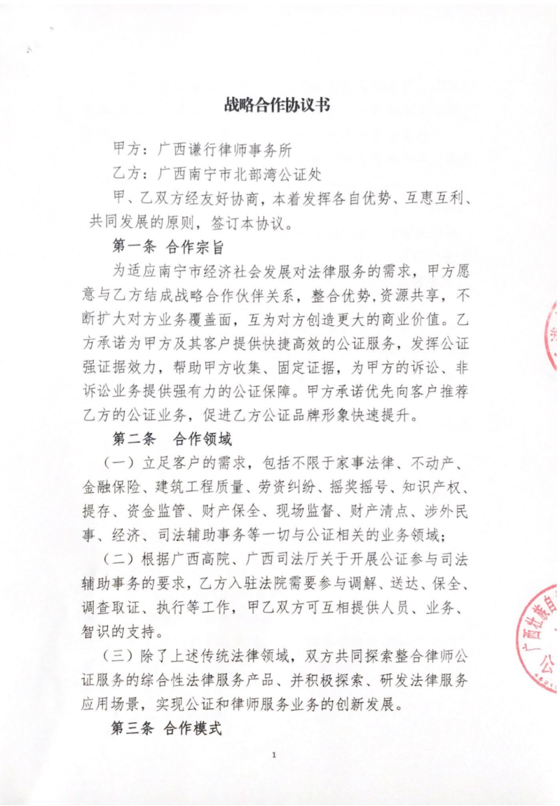 ▲謙行與廣西壯族自治區(qū)南寧市北部灣公證處戰(zhàn)略合作協(xié)議