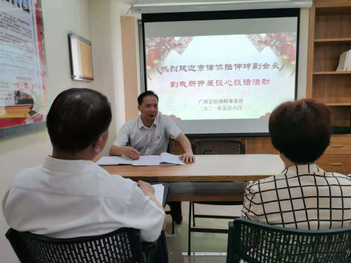 2021年5月6日上午,南寧市律師行業(yè)黨委委員、南寧市律師協(xié)會(huì)副會(huì)長陸仲坤律師到宏松所開展律師行業(yè)突出問題專項(xiàng)治理自查核查階段談心談話活動(dòng),督查宏松所開展自查核查工作。律所主任張宏新律師、黨支部書記劉彩虹律師、律師代表黃昆侖律師、蔣政律師參加此次談話活動(dòng)。