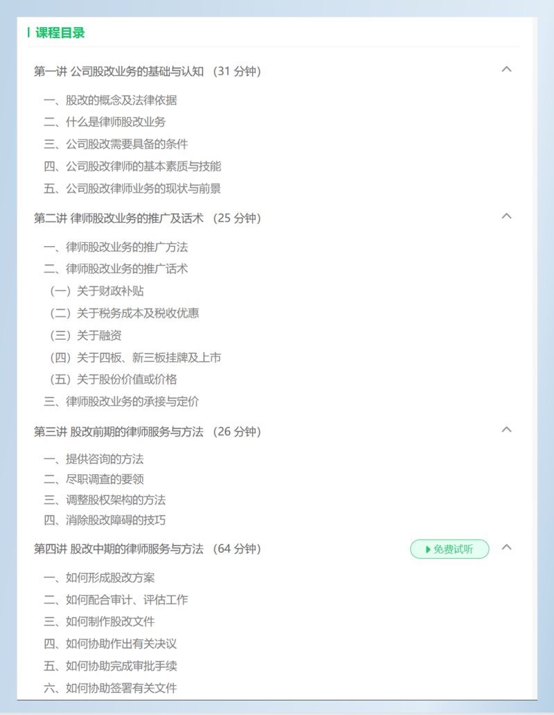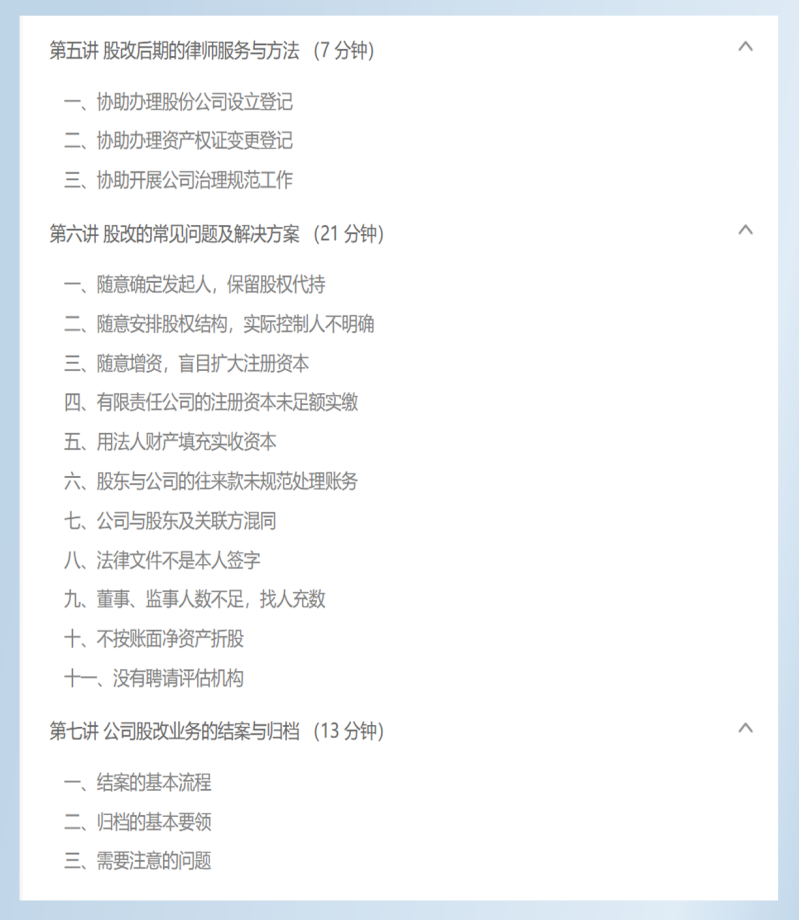 本次課程,涵蓋了公司股改業(yè)務的基礎知識、律師股改業(yè)務的推廣及話術、股改前期的律師服務與方法、股改中期的律師服務與方法、股改后期的律師服務與方法、股改的常見問題及解決方案、公司股改業(yè)務的結案與歸檔等較為系統(tǒng)、全面的內容,主要面向從未涉及或者初涉公司股改業(yè)務的年輕律師,目的是為了讓相關律師通過本課程學習,能夠從股改“小白”迅速地了解該項業(yè)務的最基本的操作,準確理解股改的定義和實質,更好地利用身邊的資源拓展股改業(yè)務,并自主地找到解決股改主要問題的通行方法,最終提升在非訴訟業(yè)務領域的專業(yè)水平和實操能力。