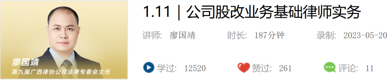 關于公司股改業(yè)務,廖國靖律師應點睛網的邀請,于2016年12月進行了首錄,并在上線后獲得了較好的評價。時隔六年,經與點睛網編導老師進行充分溝通和討論,本次進行了重新錄制,并于2023年5月20日完成。本次的重錄,是在首錄課程基礎上,進行了全面的優(yōu)化升級,將相關內容進行了重新梳理和打磨,修改了原來的部分內容,增加了一些新的知識點和實務操作事項,將一些需要更高層次才能更好理解和操作的內容進行了刪減,確定了本次課程的精準定位為基礎律師實務,主要面向年輕律師。