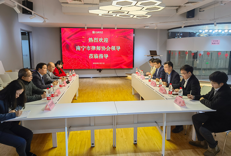 2022年3月1日,南寧律協(xié)副會(huì)長王秀良,南寧律協(xié)教育考核委員會(huì)主任葉大禧,副主任蒙秀姣、韋端寧等一行六人到訪上海漢盛(南寧)律師事務(wù)所(以下稱“漢盛南寧”)開展繼續(xù)教育培訓(xùn)工作調(diào)研,舉行繼續(xù)教育培訓(xùn)基地授牌儀式并開展座談會(huì)。漢盛南寧三位高級合伙人梁恩律師、林霄華律師、陳資長律師等進(jìn)行了熱情地接待。
