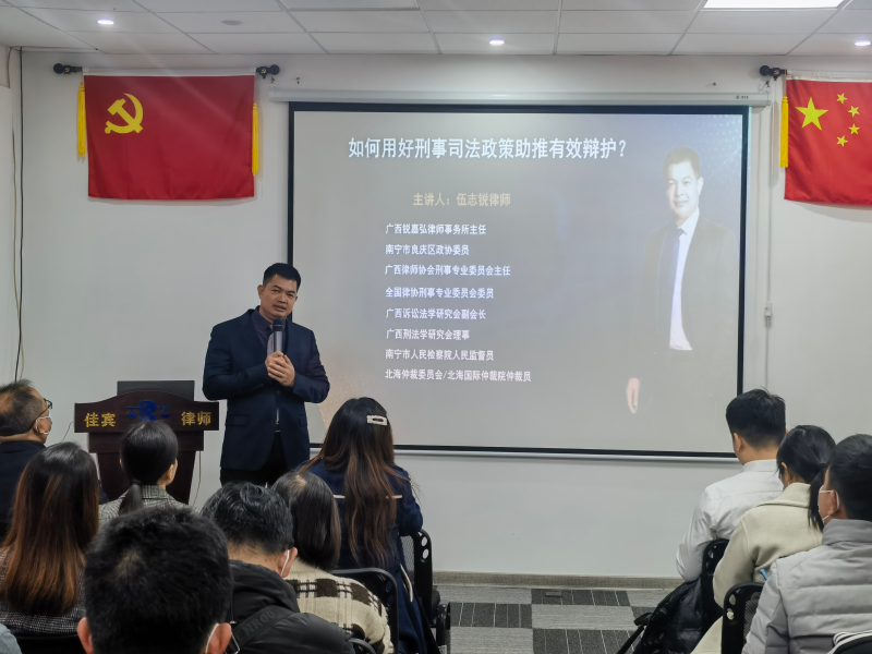 2022年12月9日下午,廣西佳賓律師事務(wù)所作為南寧市律師繼續(xù)教育培訓(xùn)基地在大會議室舉辦了關(guān)于《如何用好刑事司法政策助推有效辯護》的講座,本次講座邀請了廣西銳嘉弘律師事務(wù)所主任、廣西律師協(xié)會刑事專業(yè)委員會主任伍志銳律師主講,現(xiàn)場座無虛席。講座由本所主任王小兵律師主持。