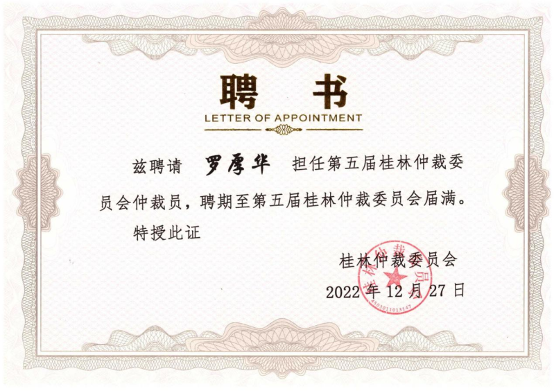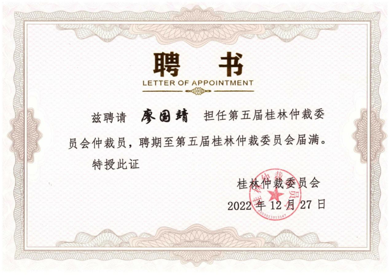 2022年12月27日,經(jīng)第五屆桂林仲裁委員會(huì)第七次委員會(huì)會(huì)議審議通過(guò),廣西璟開(kāi)律師事務(wù)所創(chuàng)始合伙人、主任廖國(guó)靖律師,廣西璟開(kāi)律師事務(wù)所創(chuàng)始合伙人、執(zhí)行主任羅厚華律師獲聘為桂林仲裁委員會(huì)仲裁員。
