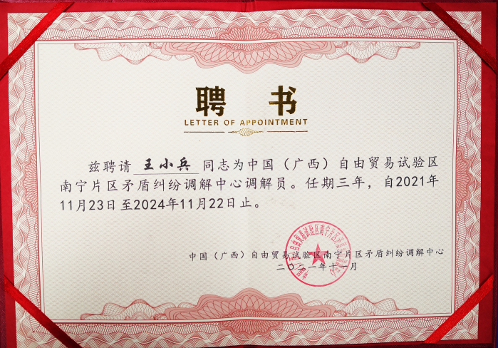 佳賓所王小兵主任獲聘為中國(廣西)自由貿(mào)易試驗(yàn)區(qū)南寧片區(qū)矛盾糾紛調(diào)解中心調(diào)解員