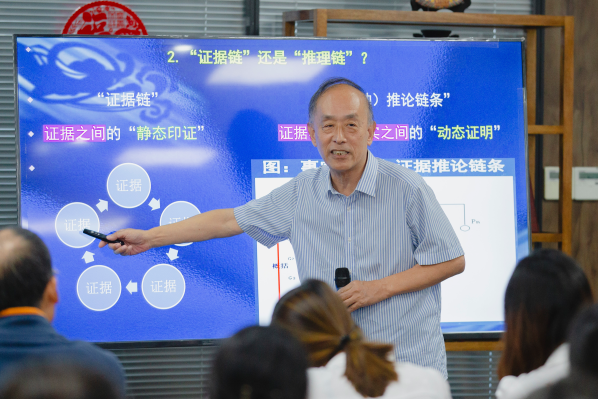 張保生教授在講座中先是提出:“印證”還是“證明”、“證據(jù)鏈”還是“推理鏈”的問(wèn)題意識(shí),再以證據(jù)分析的領(lǐng)域、《重罪檢察證據(jù)分析指引》的整體框架、局部設(shè)計(jì)(前言、范圍和相關(guān)性分析)為主要內(nèi)容結(jié)合相關(guān)案例來(lái)具體講解《重罪檢察證據(jù)分析指引》的研究思路。講座過(guò)程中張保生教授與在場(chǎng)律師互動(dòng)積極,現(xiàn)場(chǎng)氛圍熱烈、效果良好。