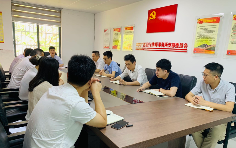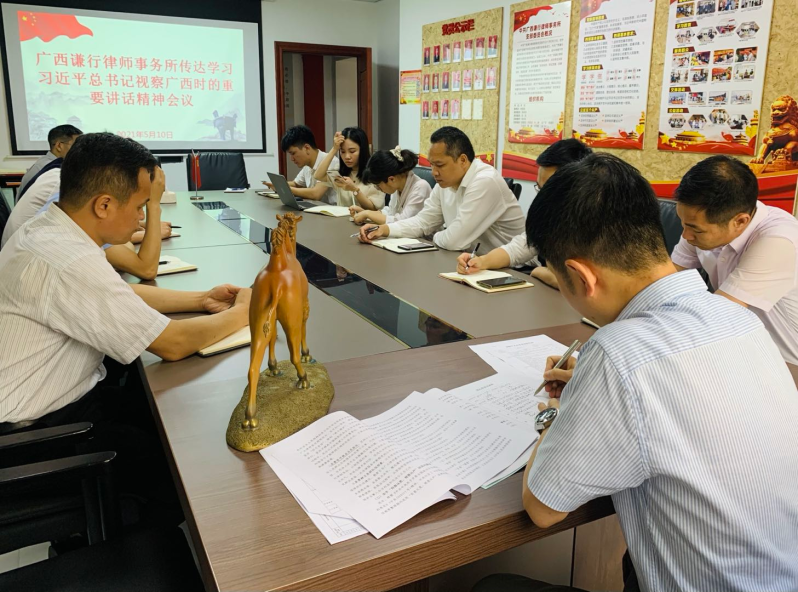 5月10日,為貫徹落實習(xí)近平總書記在廣西視察時的重要講話和重要指示精神,廣西謙行律師事務(wù)所組織召開全體會議,傳達學(xué)習(xí)貫徹習(xí)近平總書記視察廣西時的重要講話和重要指示精神,要求全體律師全面準確把握習(xí)近平總書記對廣西“四個突出特點”的重要論述和“四個新”總要求,以及四個方面的具體要求,扎實推動習(xí)近平總書記重要講話和重要指示精神在律師行業(yè)發(fā)展中生根落地。