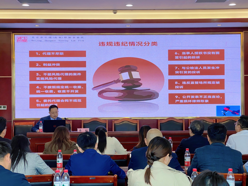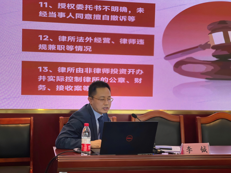 李鋮主任首先介紹近幾年來被投訴案件及處理情況,闡述了違法違紀(jì)種類,分享了自身經(jīng)驗(yàn),然后詳細(xì)講解22種違規(guī)違紀(jì)主要情形,包括:1、代理不盡責(zé);2、利益沖突;3、不能風(fēng)險(xiǎn)代理的案件實(shí)行風(fēng)險(xiǎn)代理;4、不按照規(guī)定統(tǒng)一收案、收費(fèi),收費(fèi)不開發(fā)票;5、委托代理合同不規(guī)范引起的投訴;6、當(dāng)事人授權(quán)書沒有面簽引起的投訴;7、與公檢法人員發(fā)生沖突引發(fā)的投訴;8、違反監(jiān)管場所規(guī)定被投訴;9、公開發(fā)表不正當(dāng)言論,嚴(yán)重?fù)p壞律師形象;10、對方當(dāng)事人投訴律師偽造證據(jù)、虛假陳述;11、授權(quán)委托書不明確,未經(jīng)當(dāng)事人同意擅自撤訴;12、律所法外經(jīng)營、律師違規(guī)兼職;13、律所由非律師投資開辦并實(shí)際控制律所的公章、財(cái)務(wù)、接收案;14、律師在法定辦公場所以外私設(shè)辦公場所承攬業(yè)務(wù);15、律所合伙人之間因退伙、與聘用律師之間轉(zhuǎn)所結(jié)算等產(chǎn)生的投訴;16、禁業(yè)期代理訴訟案件或者禁業(yè)期屆滿回原任職單位代理案件引起的投訴;17、不正當(dāng)宣傳、鼓吹與司法機(jī)關(guān)有特殊關(guān)系引起的被投訴;18、代理案件中泄露當(dāng)事人秘密或者刑事案件中泄密引起的投訴;19、虛假承諾引起的投訴;20、同一律師分別以兩個(gè)律所的名義與當(dāng)事人簽訂代理合同引起的投訴;21、在委托合同約定的費(fèi)用外再以其他不正當(dāng)名義收取費(fèi)用引起的投訴;22、實(shí)習(xí)人員以執(zhí)業(yè)律師的名義單獨(dú)辦案引起的投訴等內(nèi)容,并通過鮮活的案例讓參加培訓(xùn)的律師對執(zhí)業(yè)風(fēng)險(xiǎn)防范有了更深刻的認(rèn)識(shí)。