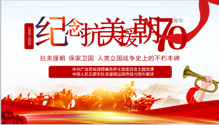 為加強(qiáng)思想教育,弘揚(yáng)愛國(guó)主義精神。2020年11月1日下午,廣西君桂律師事務(wù)所開展了以“紀(jì)念抗美援朝出國(guó)作戰(zhàn)70周年”為主題的黨課活動(dòng),并組織本所人員前往影院觀看電影《金剛川》。