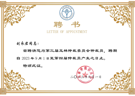 近日,玉林仲裁委員會聘請我所劉永君律師擔任該會的仲裁員,聘期自2023 年9 月1 日至第四屆仲裁員產(chǎn)生之日止。