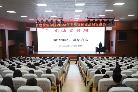 2023年12月5日,在第十個國家憲法日到來之際,國家主席習近平作出重要指示指出,憲法是治國安邦的總章程,是我們黨治國理政的根本法律依據(jù),是國家政治和社會生活的最高法律規(guī)范。為貫徹落實習近平法治思想和憲法法治教育的指導精神,增強學生的法律意識和法治觀念,學憲法、講憲法,廣西先衡律師事務所應百色職業(yè)學院邀請,參加該院2023年憲法宣傳周法制宣講會。