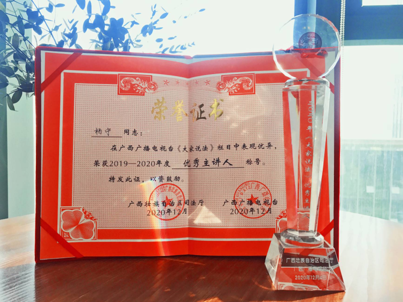 12月4日,廣西壯族自治區(qū)黨委宣傳部、自治區(qū)黨委全面依法治區(qū)辦、自治區(qū)司法廳聯(lián)合舉辦的2020年全區(qū)“12·4”憲法宣傳周活動(dòng)啟動(dòng)儀式在南寧舉行。啟動(dòng)儀式上,進(jìn)行了《大家說法》欄目?jī)?yōu)秀主講人頒獎(jiǎng)儀式,上海漢盛(南寧)律師事務(wù)所高級(jí)合伙人楊寧律師榮獲《大家說法》欄目“2019-2020年度優(yōu)秀主講人”稱號(hào),是三位律師獲獎(jiǎng)?wù)咧弧?/span>