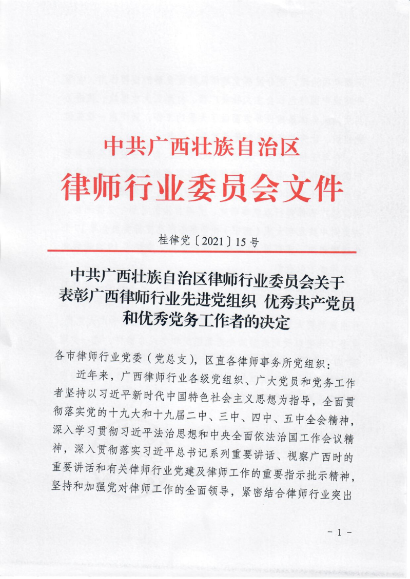 此次表彰大會對廣西律師行業(yè)20個先進基層黨組織、50名優(yōu)秀共產(chǎn)黨員律師和19名優(yōu)秀黨務(wù)工作者進行了表彰。中共廣西謙行律師事務(wù)所支部委員會滕黃鐵律師榮獲“廣西律師行業(yè)優(yōu)秀共產(chǎn)黨員”榮譽稱號。