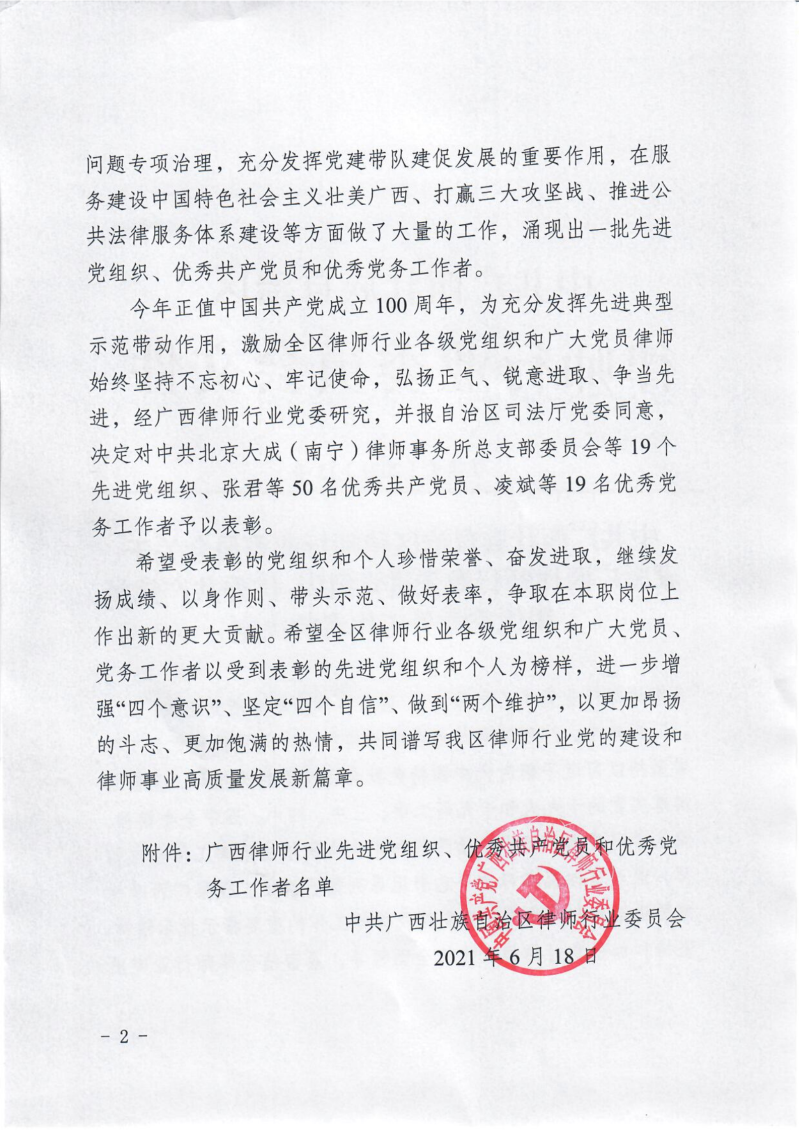 滕律師獲此殊榮,激勵謙行律師始終堅持不忘初心、牢記使命,弘揚正氣、銳意進取、爭當先進,不斷增強“四個意識”、堅定“四個自信”、做到“兩個維護”,以更加昂揚的斗志、更加飽滿的熱情,共同譜寫廣西律師行業(yè)黨的建設(shè)和律師事業(yè)高質(zhì)量發(fā)展新篇章,以實際行動獻禮中國共產(chǎn)黨成立100周年!