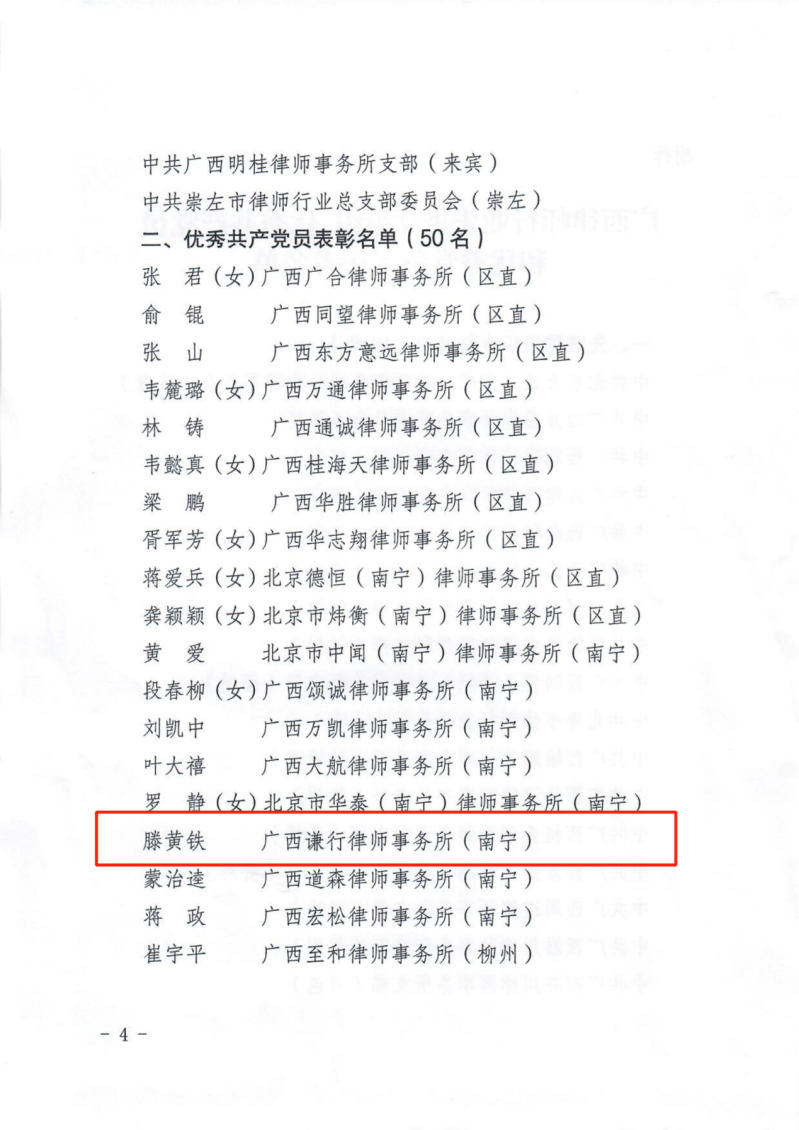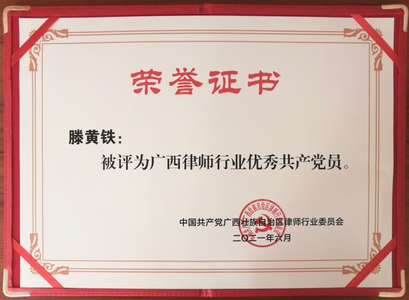 滕黃鐵律師作為廣西謙行律師事務(wù)所的骨干律師,積極參加司法行政機關(guān)組織的政治學(xué)習(xí),積極參與律所黨建、所建工作,在各項工作中充分發(fā)揮了黨員的模范帶頭作用,在執(zhí)業(yè)過程中,以事實為根據(jù),以法律為準繩,維護國家法律的正確實施,維護當事人的合法權(quán)益。榮譽代表著責(zé)任,滕律師表示將珍惜榮譽,不忘初心、牢記使命,積極履行社會責(zé)任,引領(lǐng)行業(yè)良好風(fēng)尚,以更加堅定的黨性、更加務(wù)實的作風(fēng)、更加強烈的使命感、責(zé)任感和榮譽感,充分發(fā)揮律師職能優(yōu)勢,繼續(xù)發(fā)揚成績,做好表率,為全面推進依法治國進程、促進廣西律師行業(yè)健康發(fā)展貢獻力量。