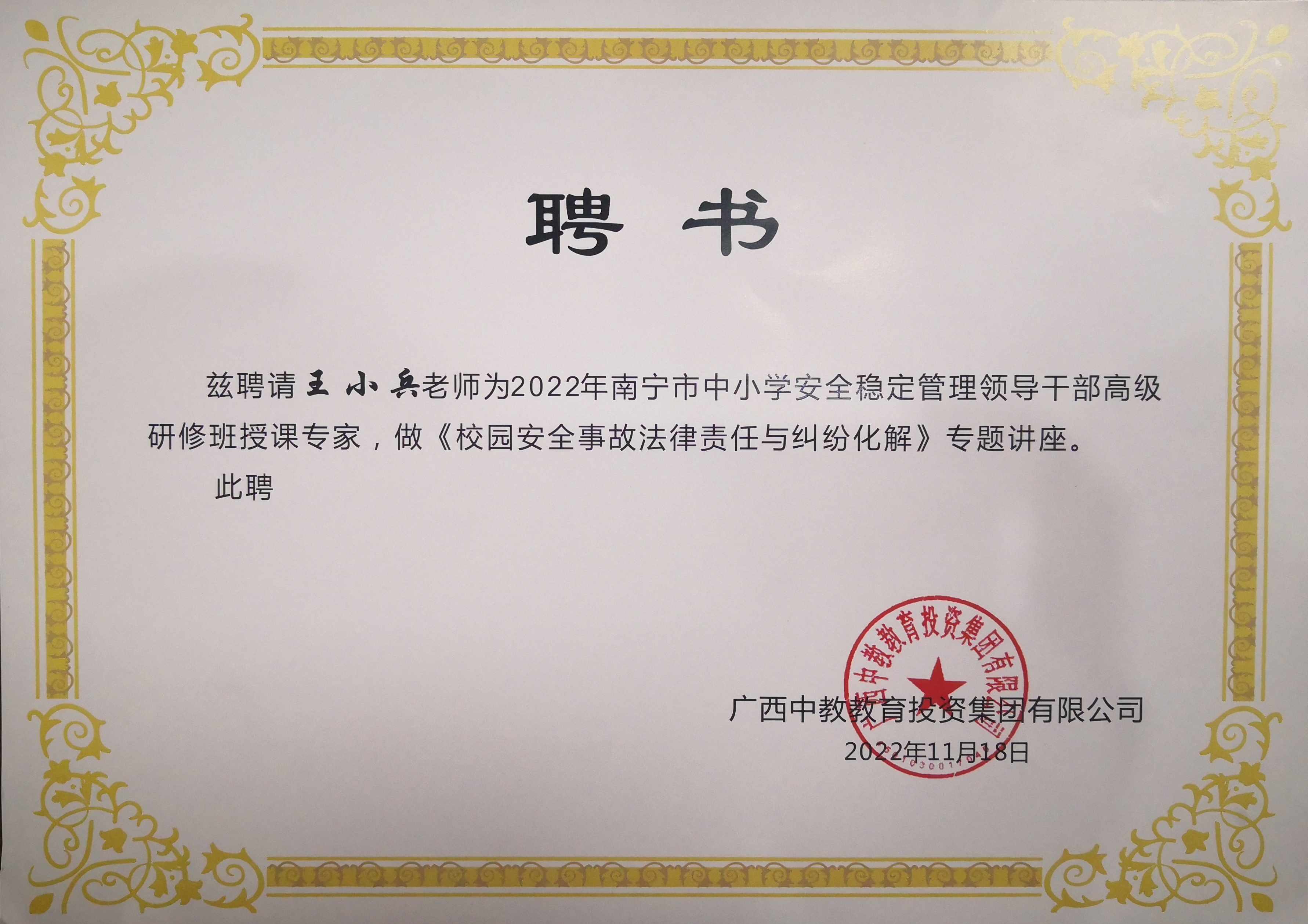 2022年11月18日,廣西佳賓律師事務(wù)所王小兵律師接受廣西中教教育投資集團(tuán)有限公司的邀請(qǐng),以授課專家的身份到培訓(xùn)基地為2022年南寧市中小學(xué)安全穩(wěn)定管理領(lǐng)導(dǎo)干部高級(jí)研修班作《校園安全事故法律責(zé)任與糾紛化解》的專題講座。