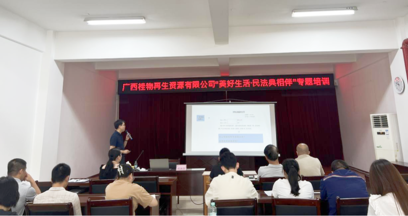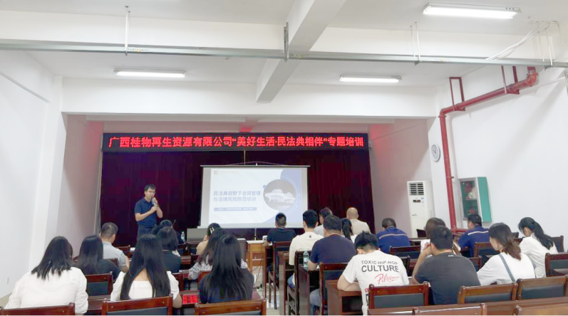 2023年6月14日,以“《民法典》宣傳月”為契機,應顧問單位廣西桂物再生資源有限公司的邀請,廣西璟開律師事務所鄭永鈞律師為公司全體人員開展了主題為“民法典視野下合同管理與法律風險防范”的專題培訓。