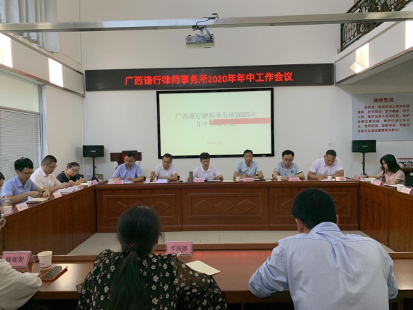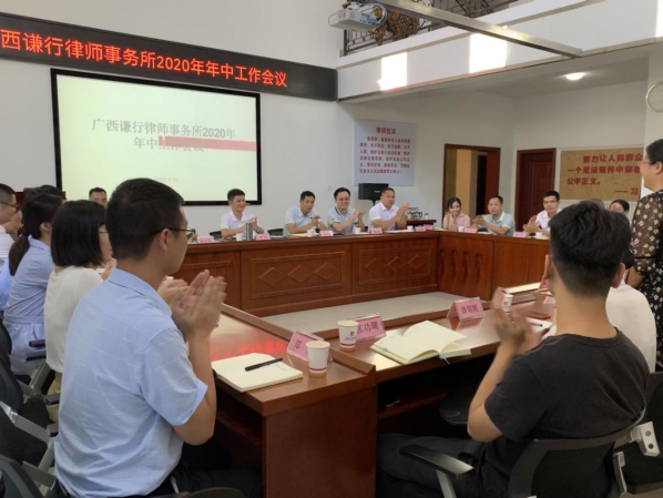 為更好總結(jié)律所上半年工作,規(guī)劃部署下半年各項工作,6月30日下午,廣西謙行律師事務所2020年年中工作會議在謙行模擬法庭圓滿召開。會議由譚京凱副主任主持,律所羅旭主任,楊家聰、賴志權(quán)副主任,合伙人滕黃鐵、鄭憲玲及律所人員近30人參加了會議。