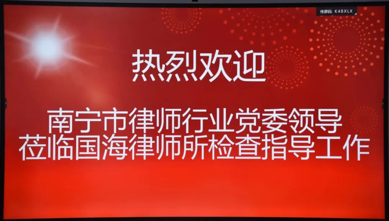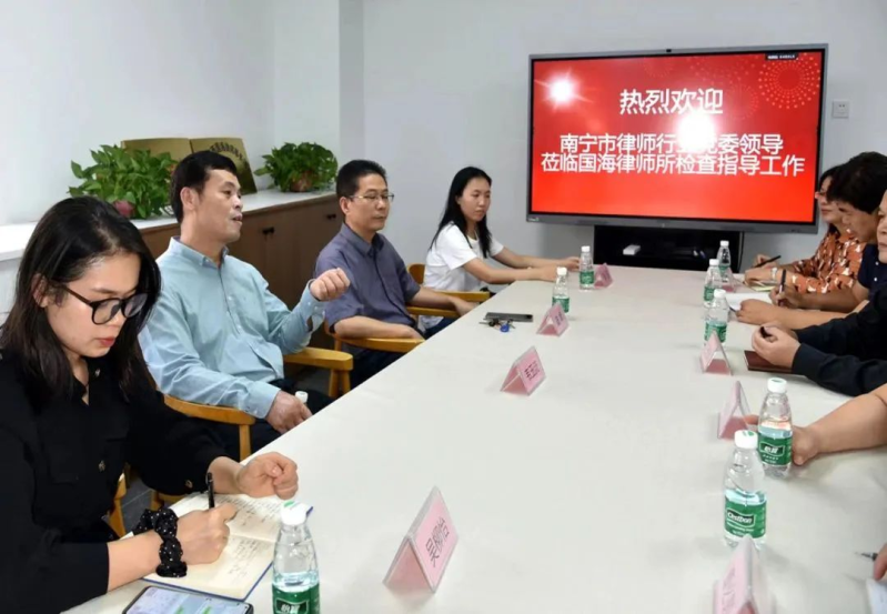 2022年11月28日下午,南寧市司法局三級(jí)調(diào)研員、市律師行業(yè)黨委書(shū)記韋玉流,市司法局律師工作科科長(zhǎng)、市律師行業(yè)黨委副書(shū)記陸峰以及行業(yè)黨委辦工作人員吳柳怡、張玉一行到廣西國(guó)海律師事務(wù)所檢查指導(dǎo)。